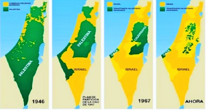 Pero Israel es un Estado artificial conformado (1948) como enclave militar imperialista contra Palestina y todos los pueblos de Asia Occidental, erigido sobre la base del terror, la muerte de miles de palestinos y la diáspora de ese pueblo. No se habla de que muchos territorios fueron analizados en 1904 por los sionistas para construir su estado: desde un protectorado británico en el Sinaí egipcio, Argentina, Kenia en África o Palestina.