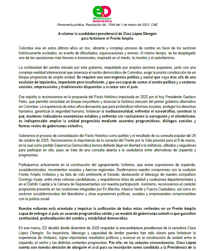 Dijo que desde Esperanza Democrática y el movimiento Todos Somos Colombia que lidera la candidata López Obregón no solo están empeñados en jalonar las reformas sociales pendientes, sino que además están comprometidos en ensanchar el Frente Amplio Unitario para garantizar una amplia mayoría parlamentaria que posibilite avanzar en las transformaciones sociales, económicas y políticas que reclaman las mayorías nacionales.