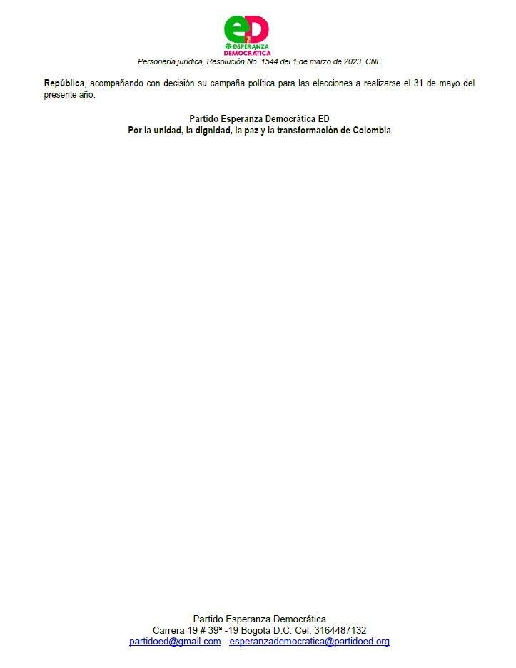 El respaldo de su fórmula vicepresidencial María Consuelo del Río y del Partido Esperanza Democrática refuerza la viabilidad política de su propuesta, que se presenta ante la opinión pública como una invitación a la confianza, el optimismo., el entendimiento y el trabajo colectivo por una Colombia justa, equitativa y democrática.