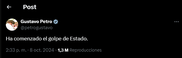 En otra publicación expresó: «El Presidente llegará hasta donde el pueblo diga, no importa mi vida. Cinco politiqueros pagos no van a hundir la democracia en Colombia, llegó el momento de moverse. Lo advertí, pero no reaccionaron. Se creen con el derecho de burlarse del voto popular y aquí no hay un pueblo arrodillado».