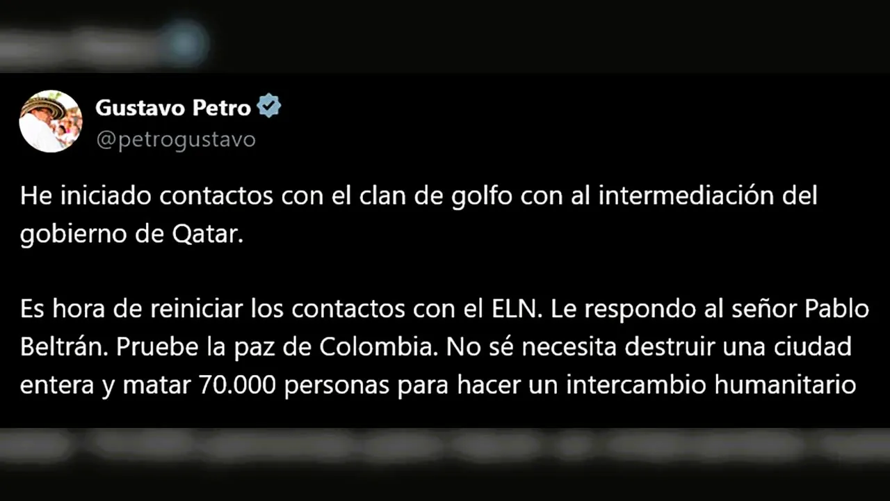 A través de su cuenta de la red social X, el presidente Gustavo Petro anunció que ha iniciado contactos con el denominado Clan del Golfo mediante intermediación del Gobierno de Qatar.