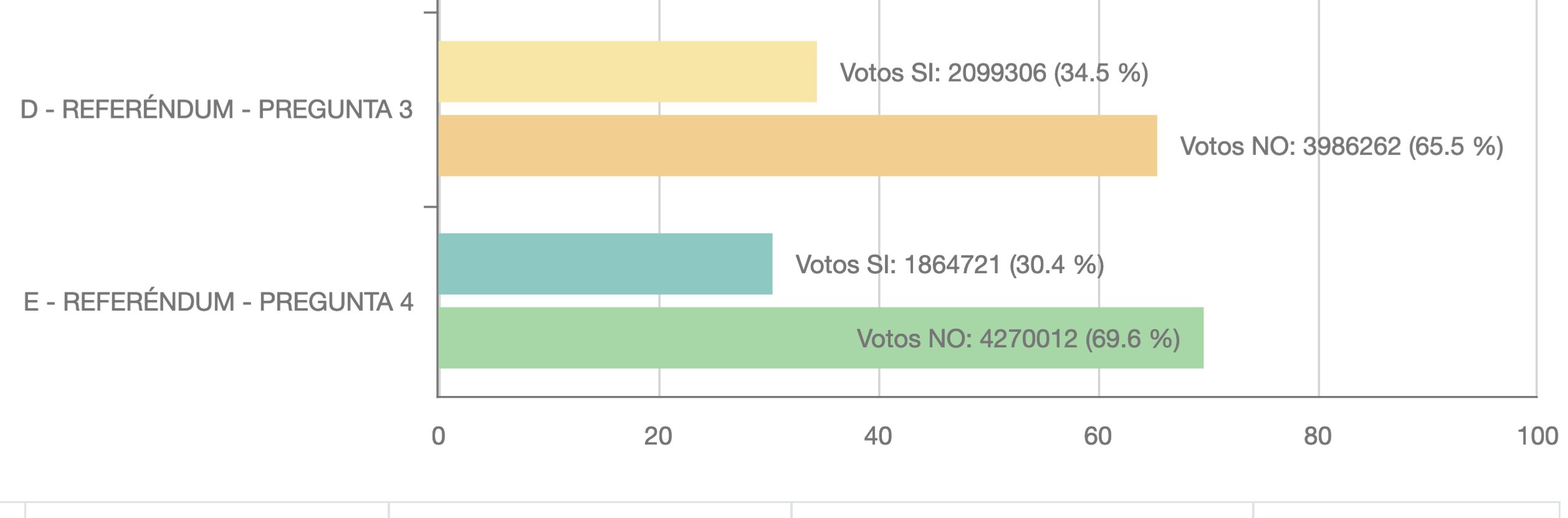 De la misma manera, en la pregunta E: “¿Está usted de acuerdo con enmendar la Constitución de la República y reformar el Código de Trabajo para el contrato de trabajo a plazo fijo y por horas, cuando se celebre por primera vez entre el mismo empleador y trabajador, sin afectar los derechos adquiridos de los trabajadores”, el No superó el66 por ciento, mientras el Sí logró apenas el 34 por ciento.