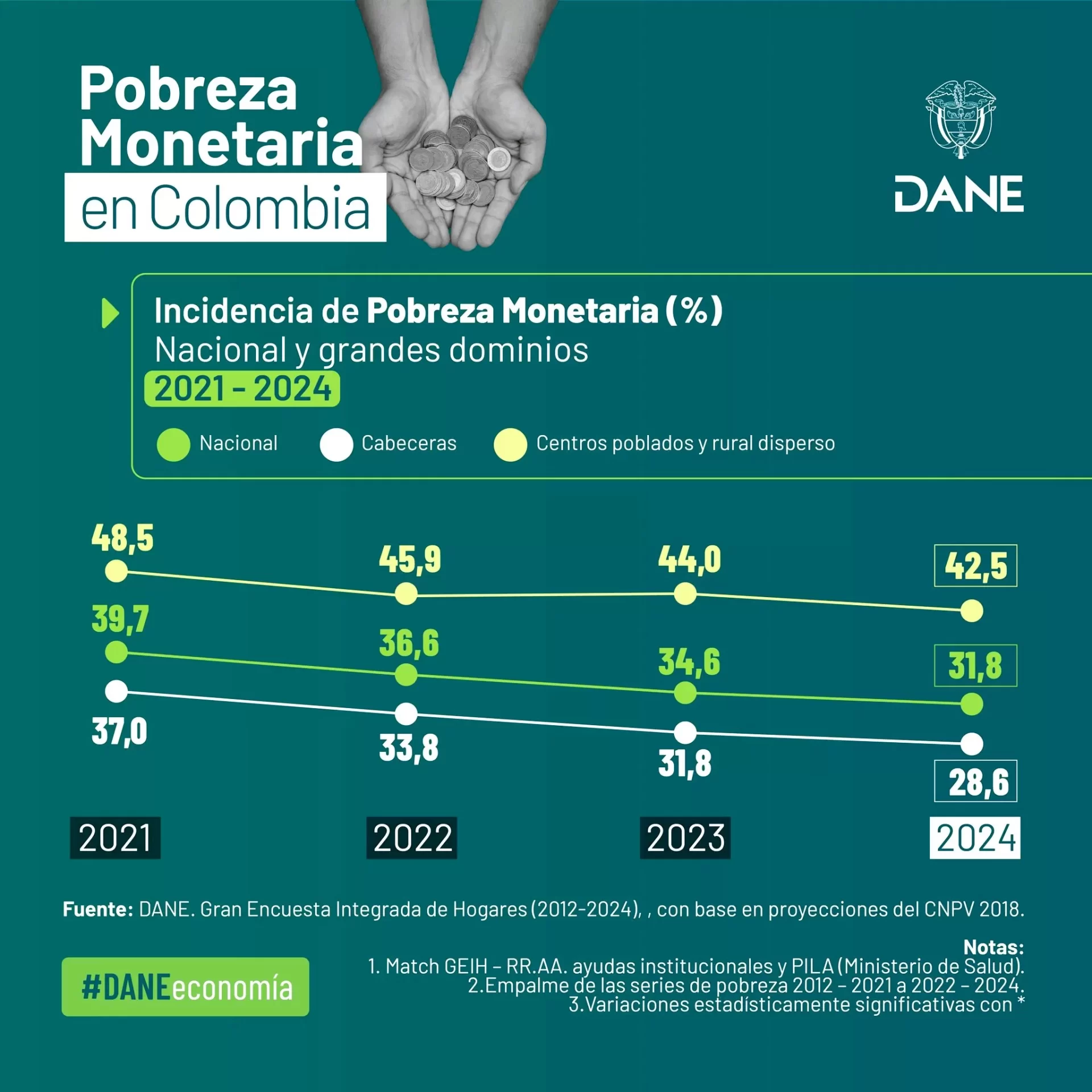 En un hecho histórico en la economía nacional, la pobreza monetaria en Colombia en 2024 fue la más baja que se haya registrado desde 2012: pasó de 34,6 % en 2023 a 31,8 %. Según cifras del Departamento Administrativo Nacional de Estadística (DANE), alrededor de 1,2 millones de personas salieron de la pobreza en el país.