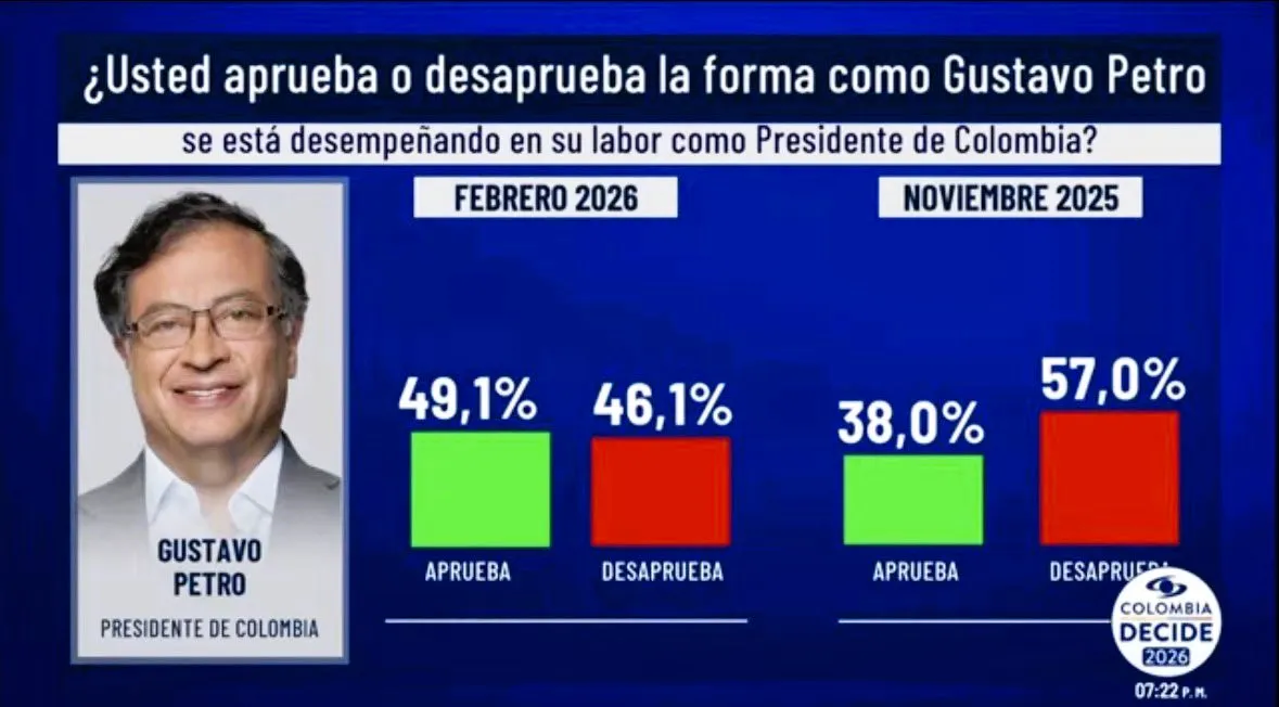 A cinco meses de culminar su mandato, la gestión del presidente Gustavo Petro aumentó en 11 puntos, ubicándose en 49,1 % de respaldo en febrero de 2026, frente al 38 % que tenía en la última medición, en noviembre de 2025.