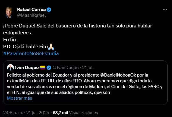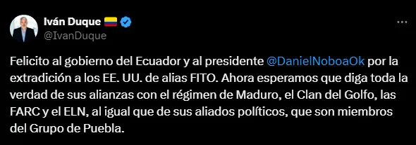 En su frívolo e insustancial estilo el cuestionado expresidente colombiano Iván Duque Márquez expresó en su cuenta en la red social X que felicita al régimen ecuatoriano del bananero neoliberal Daniel Noboa por la extradición a Estados Unidos del capo del narcotráfico José Adolfo Macías, líder de Los Choneros, conocido con el alias de ‘Fito’ y que espera que declare sobre sus nexos con agrupaciones al margen de la ley y sus “aliados políticos que son miembros del Grupo de Puebla”.