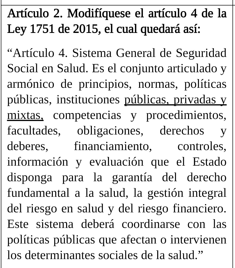 Es decir, se trata de modificar una Ley que ha resultado beneficiosa para la población para cambiar su espíritu e impedir que la Reforma a la Salud acabe con la intermediación financiera de las EPS en la prestación del derecho a la salud. Que todo cambie para que todo siga igual.