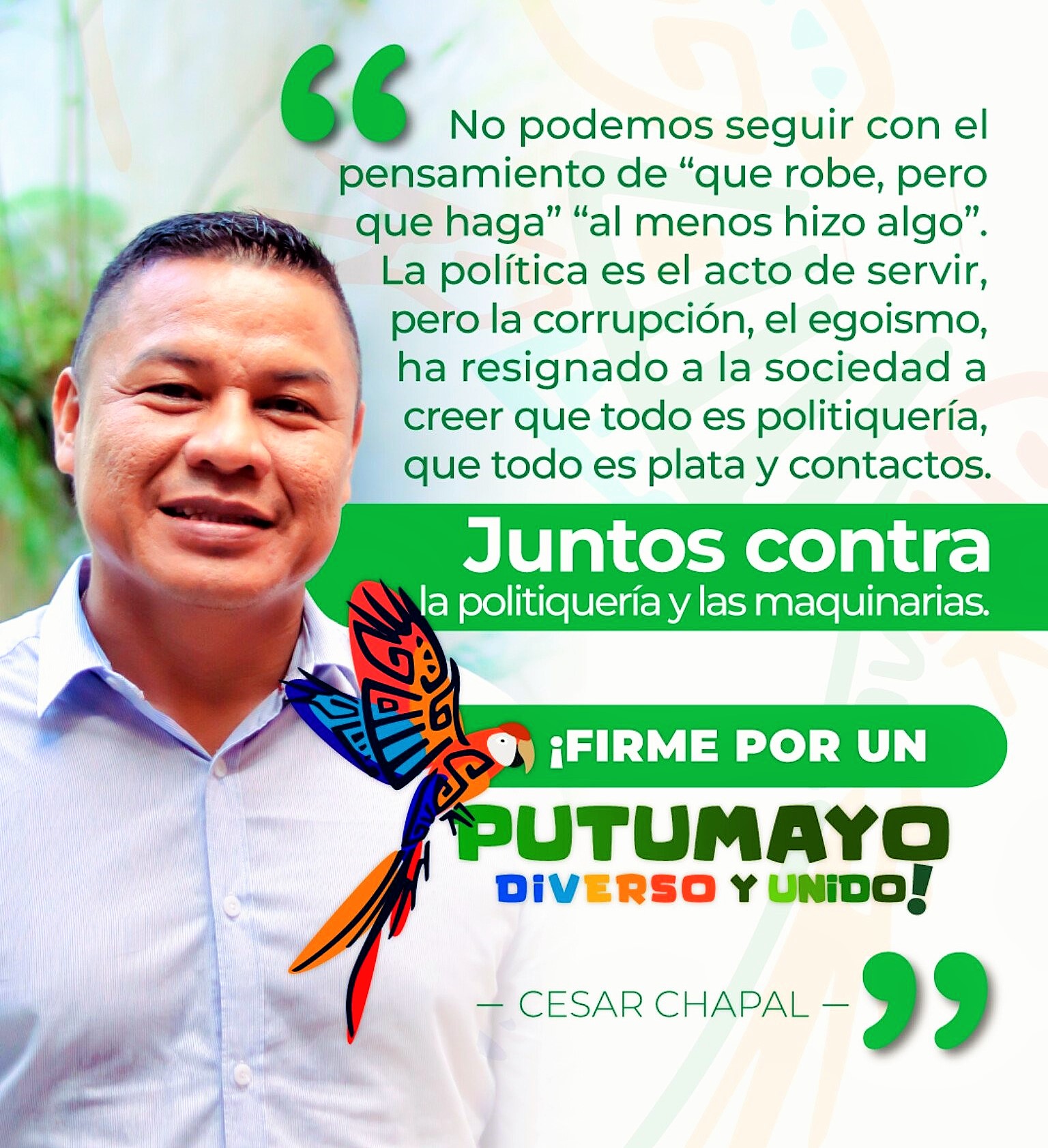 César Chapal, es un abogado especialista en contratación estatal de la Universidad Externado de Colombia, experto en derechos étnicos y ascendiente de la etnia Cofán. Está comprometido con una visión de transformación integral de su departamento y lucha frontal contra la corrupción.