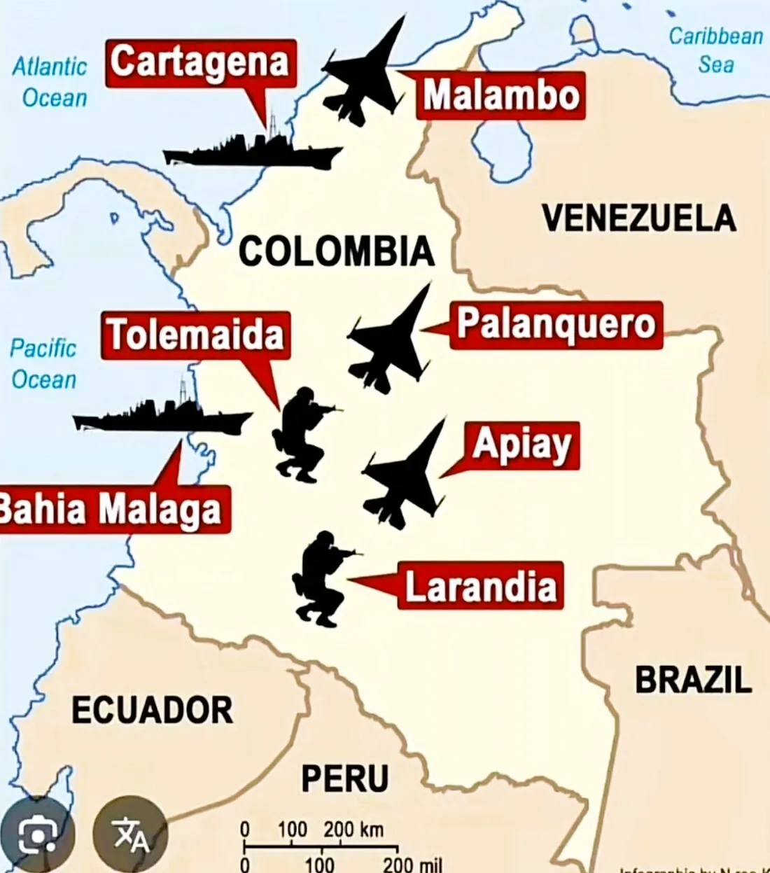 • Hay al menos siete instalaciones con cooperación militar estadounidense: Tolemaida, Palanquero, Apiay, Malambo, Larandia, Cartagena y Bahía Málaga.