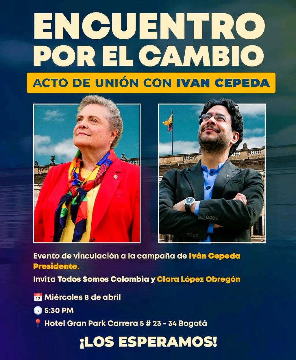 Este miércoles 8 de abril el candidato presidencial Iván Cepeda Castro recibe públicamente la adhesión de la senadora Clara López Obregón y su movimiento Todos Somos Colombia, así como de sus aliados del partido Esperanza Democrática.