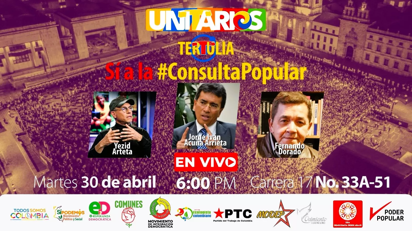 La cita es este miércoles 30 de abril a las 6:00 PM en la Casa Amarilla (Carrera 17 No. 33A-51) o en la transmisión en vivo por todas las redes sociales de Unitarios y en la plataforma web de Todos Somos Colombia: https://todossomoscolombia.org/