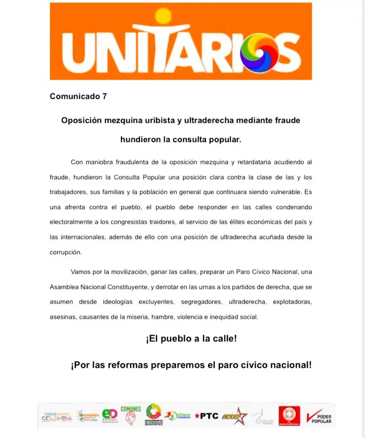 A través de una declaración pública, el espacio político convergente Unitarios anunció que tras el hundimiento de la Consulta Popular por parte de los sectores de la ultraderecha “mediante fraude” y trapisondas, “el pueblo debe responder en las calles” condenando electoralmente a los congresistas que le vienen dando la espalda al pueblo colombiano.